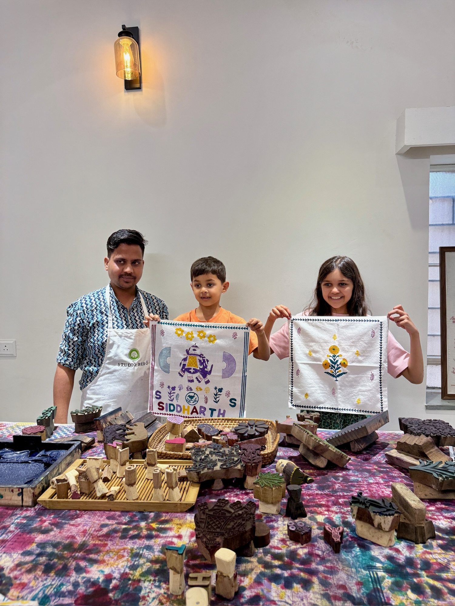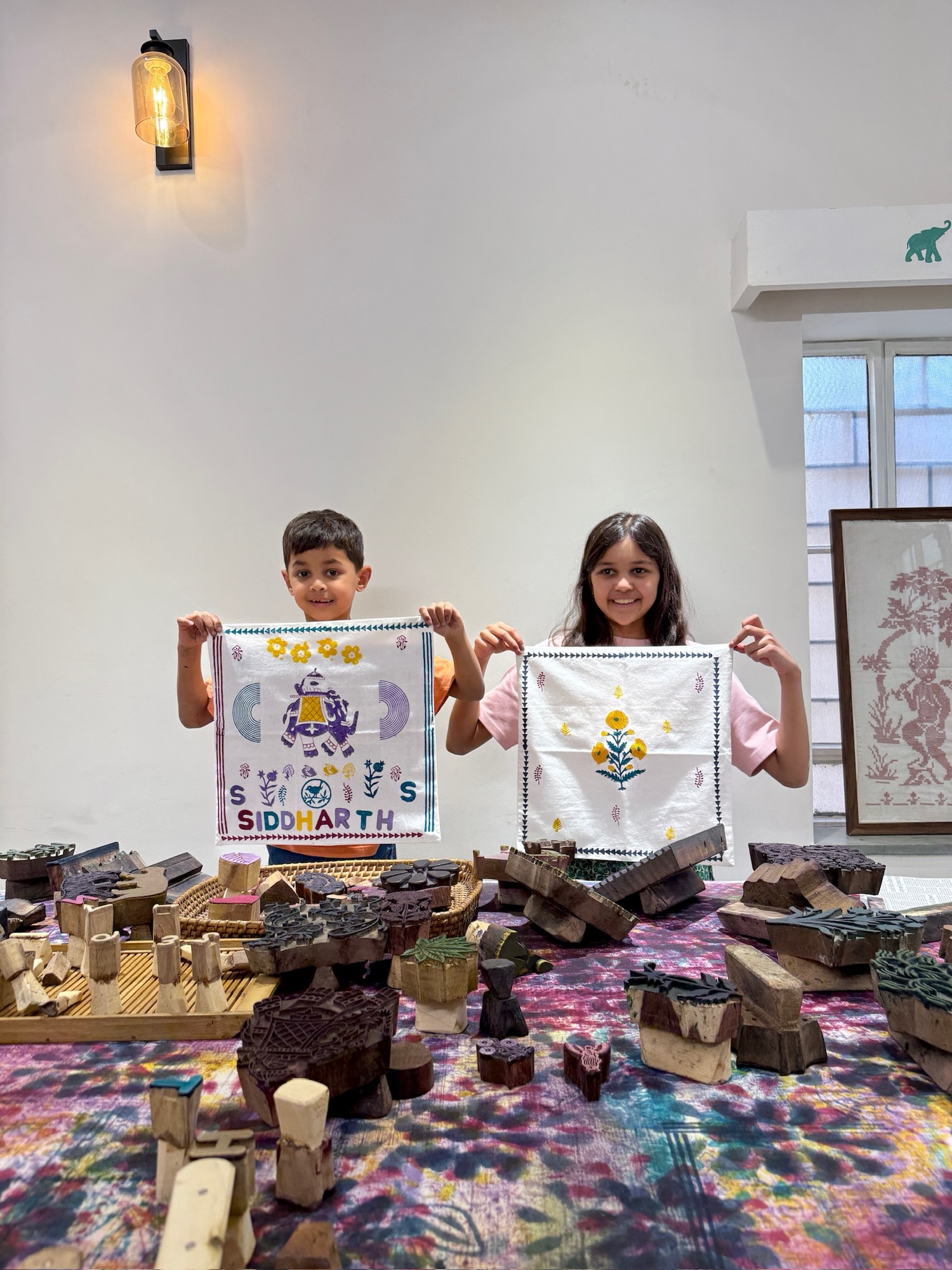 Me and my brother did a block printing workshop; we decorated pillowcases by stamping carved wooden blocks into colour pads and then imprinting it onto the pillowcase. It was super fun!!