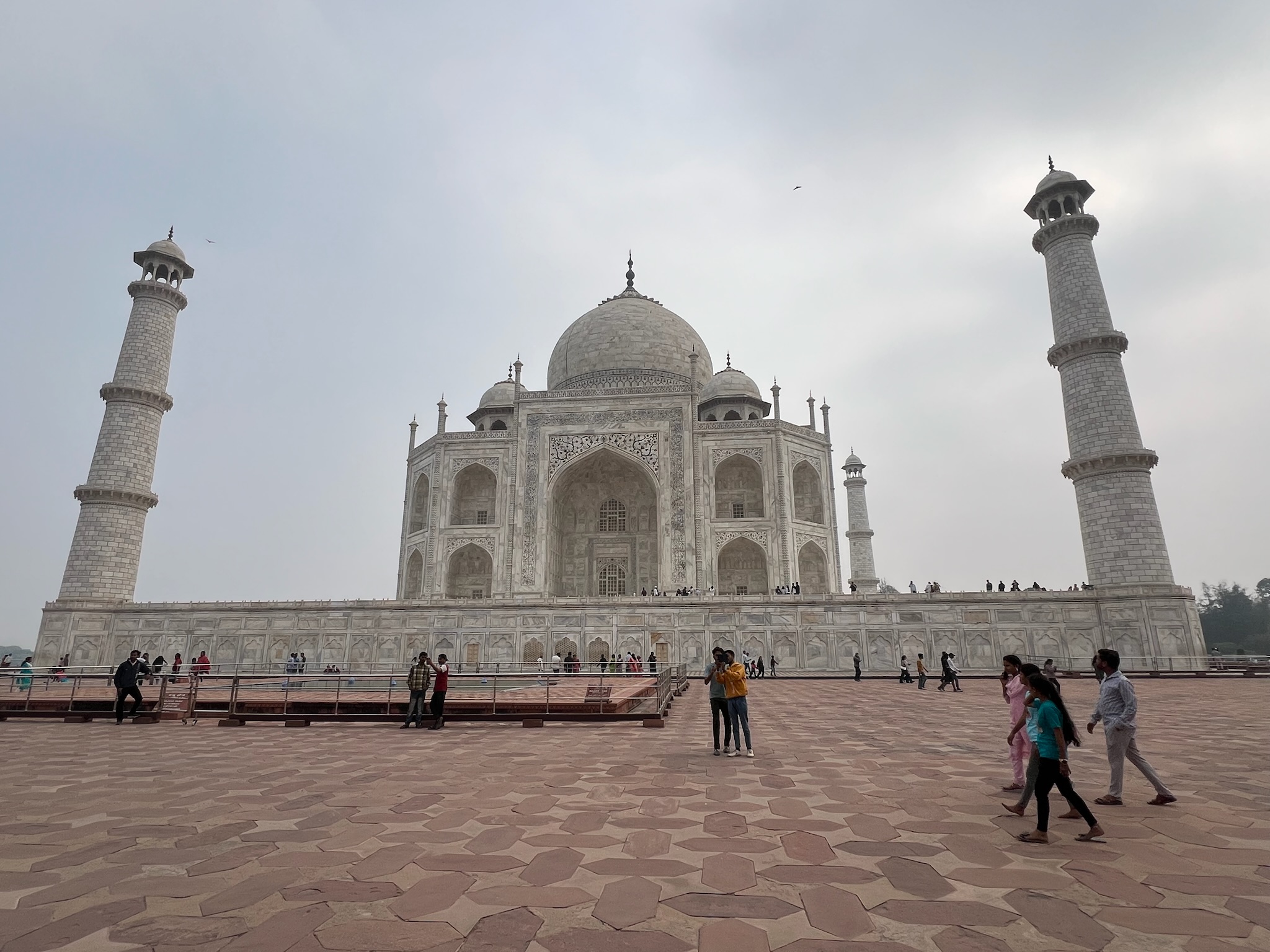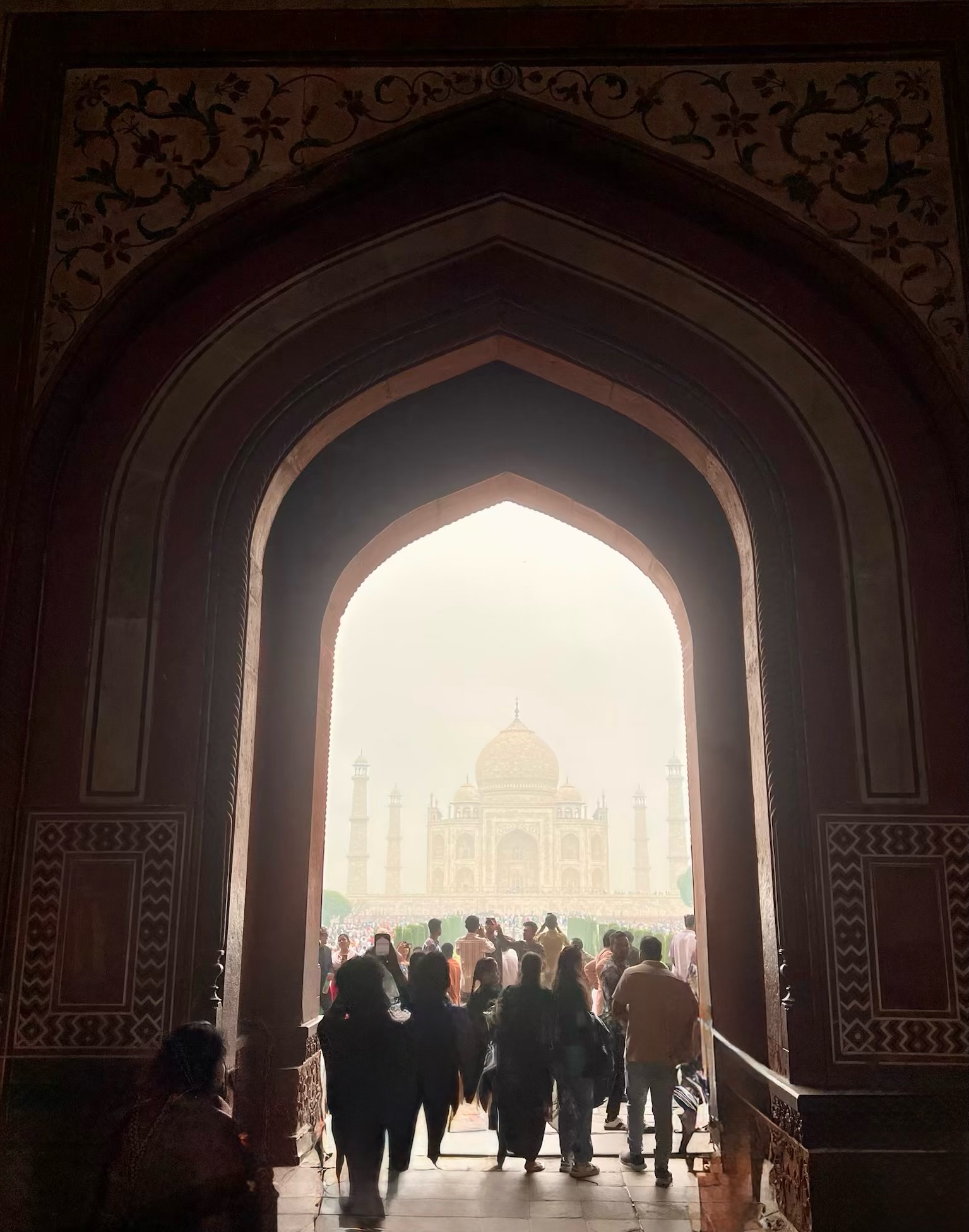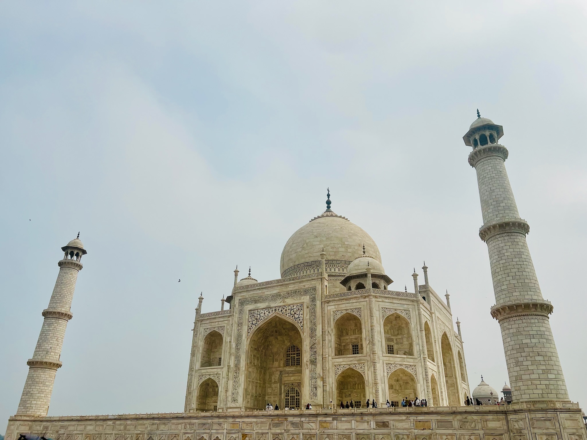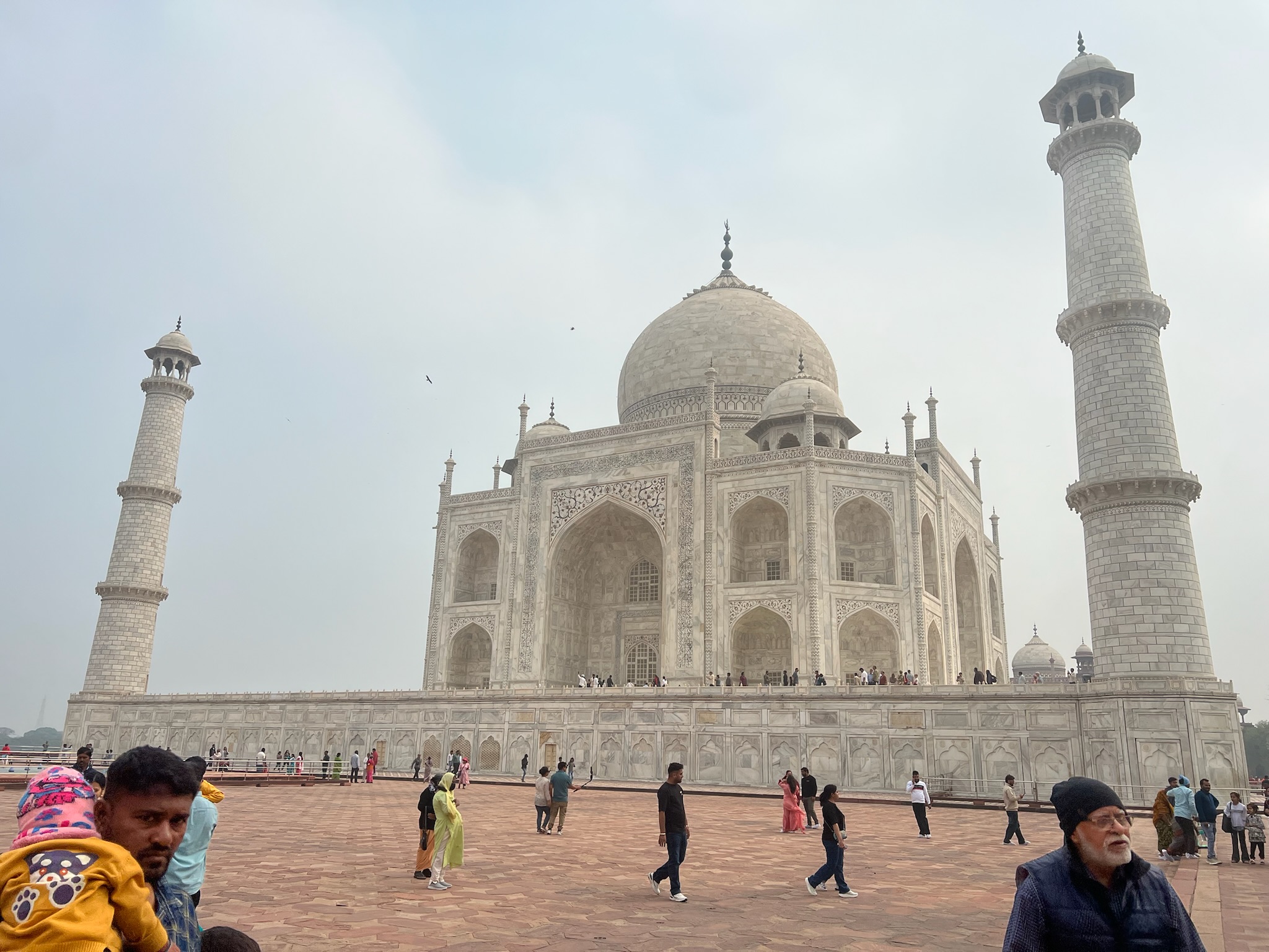 I had been looking forward to going to the Taj Mahal for ages! When I woke up on the morning that we were going to it I was SO excited! In the car anticipation quivered. When we got there we stood in the precise centre of an ornately inlaid and carved gate and saw a magnificent marble structure rising out of the mist like an elegant, dreamy apparition. It looked so beautiful!